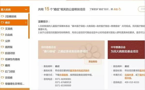 目前,该平台一共有158个疾病公益项目,除“癌症”外,白血病、乙肝、艾滋病等重大或罕见疾病关键词,也能进入公益帮扶信息平台。