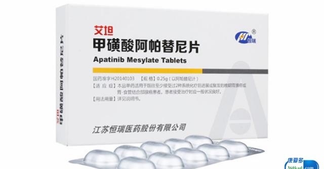适应症:甲磺酸阿帕替尼片适用于曾经接受过2种系统化疗后进展或者复发的晚期胃腺癌或胃-食管结合部腺癌患者。患者接受治疗时应一般状况良好。
